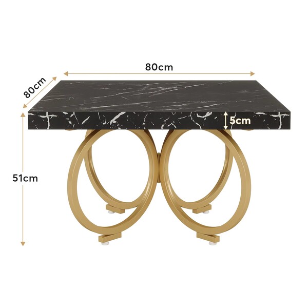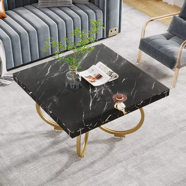 Features: This black coffee table features a combination of a gold geometric base and a black faux marble tabletop, to enhance the ambiance of your home. The square coffee table comes with a spacious and practical 31.5-inch tabletop. It offers plenty of space for various items, a solid geometric base, a novel gold frame with an atmospheric silhouette, 4 ring cutouts and a minimalist style that makes it a work of art. Wear-resistant and rust-resistant, the support is stable and does not wobble. The bottom is equipped with rubber plugs for balance and to protect the floor from scratches.
